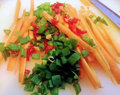 Pilko chili, valkosipuli, inkivääri ja kevätsipuli pienemmäksi silpuksi. Raasta tai suikaloi porkkana.