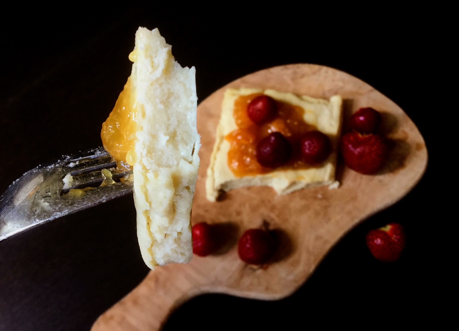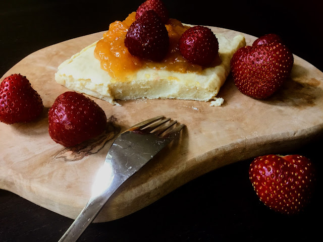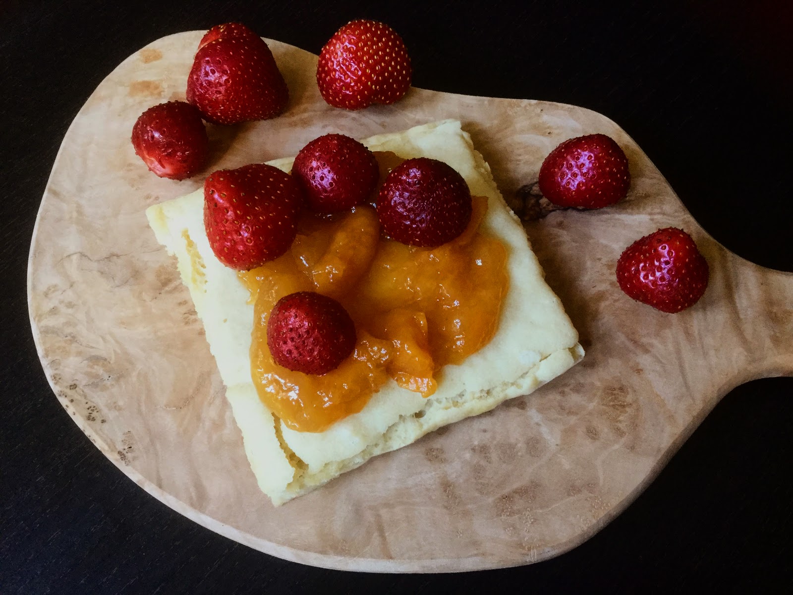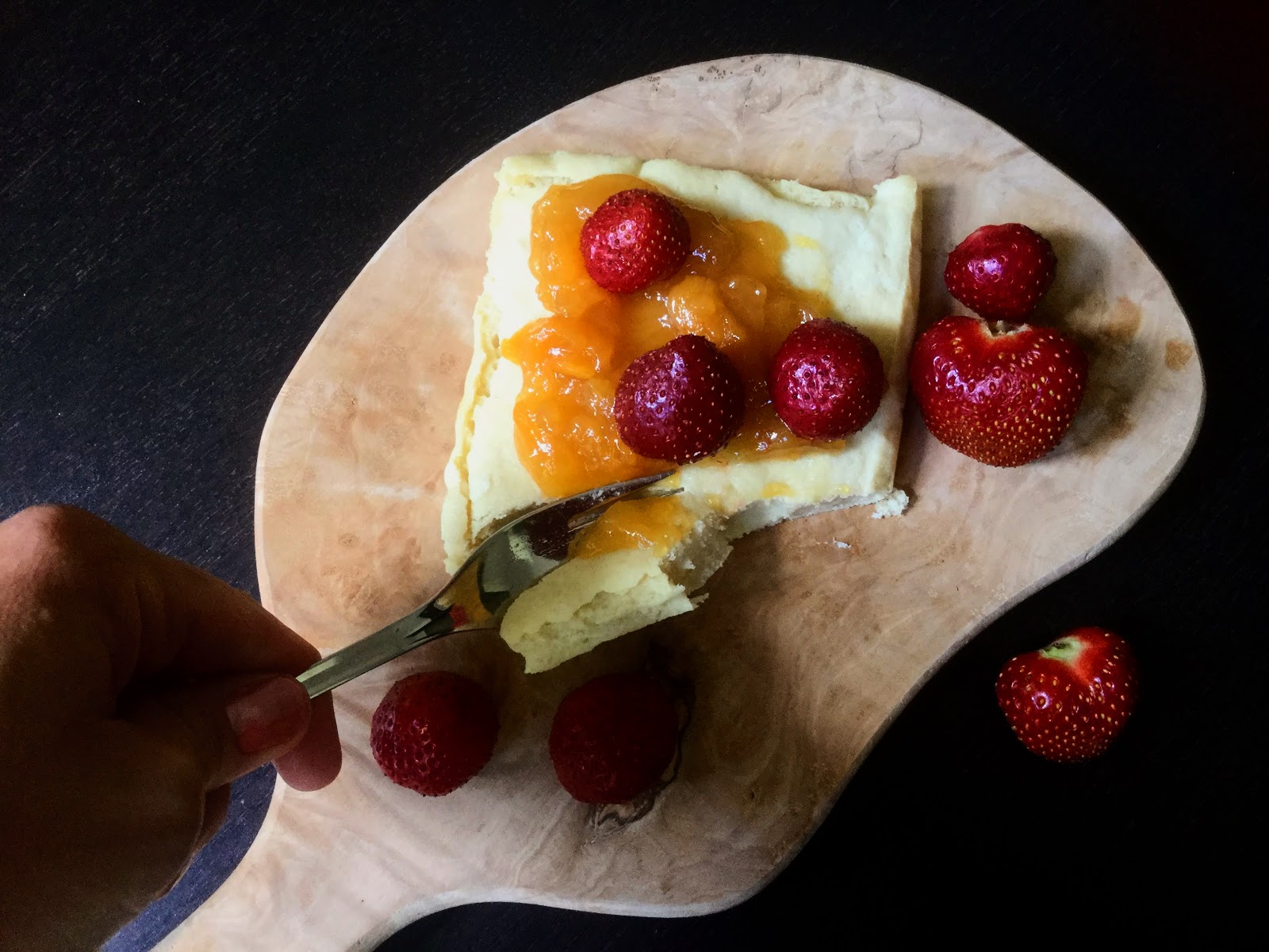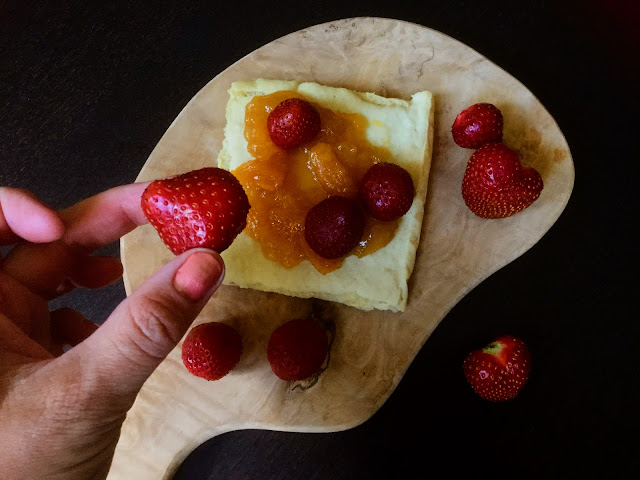 Gluteeniton ja maidoton pannukakku oli täydellisen mehevää, pullamaista ja maukasta. Nautin sitä persikkahillon sekä tuoreiden mansikoiden kanssa. Myös lapset kiskaisivat useamman palan.