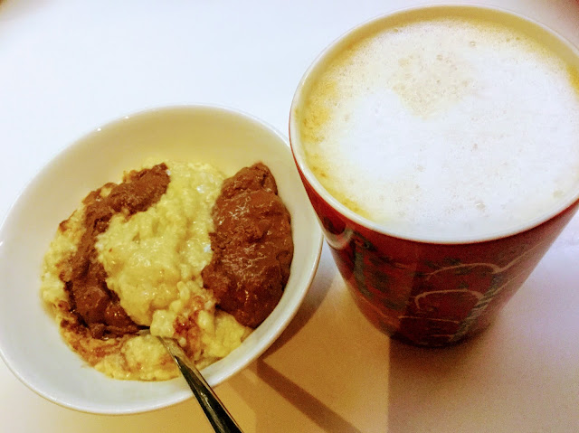 Kyllä se lämmin puuro pannulla paistetulla banaanilla, kanelilla ja raakasuklaatahnalla sekä iso maidoton, vaahtoava latte sitten saavatkin väsyneen aamun alkamaan hyvin!