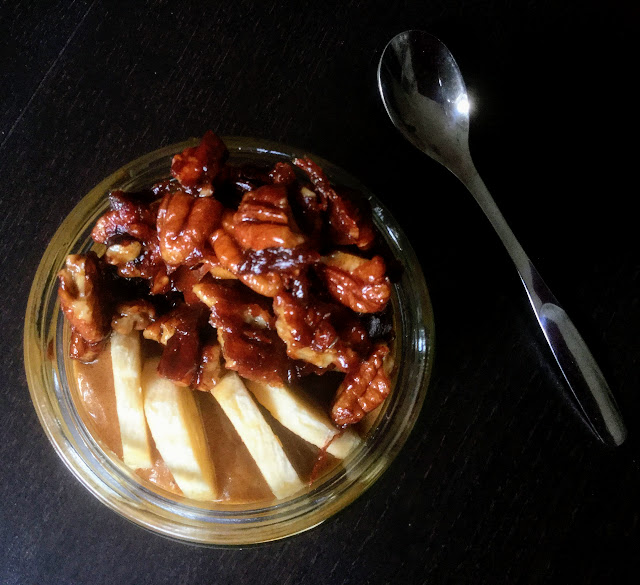 Jos maistat banaanivanukasta tällaisenaan, maku ei ehkä vielä hurmaa. Vanukkaassa maistuu hapan soijajogurtti, ja ainakin omasta mielestäni se olisi kaivannut sekaan jonkinlaista makeutusta. Koska makeutta on kuitenkin tulossa kinuskin ja karamellisoitujen pähkinöiden mukana, ei itse vanukas mielestäni vaadi makeutusta erikseen. Taatelikinuski ja pähkinät ovat nimittäin sen verran makea lisä happamaan vanukkaaseen, että kokonaisuus saa kyllä varmasti suun makeaksi!