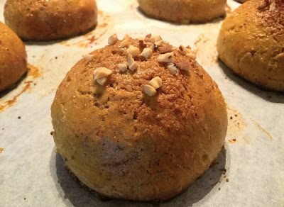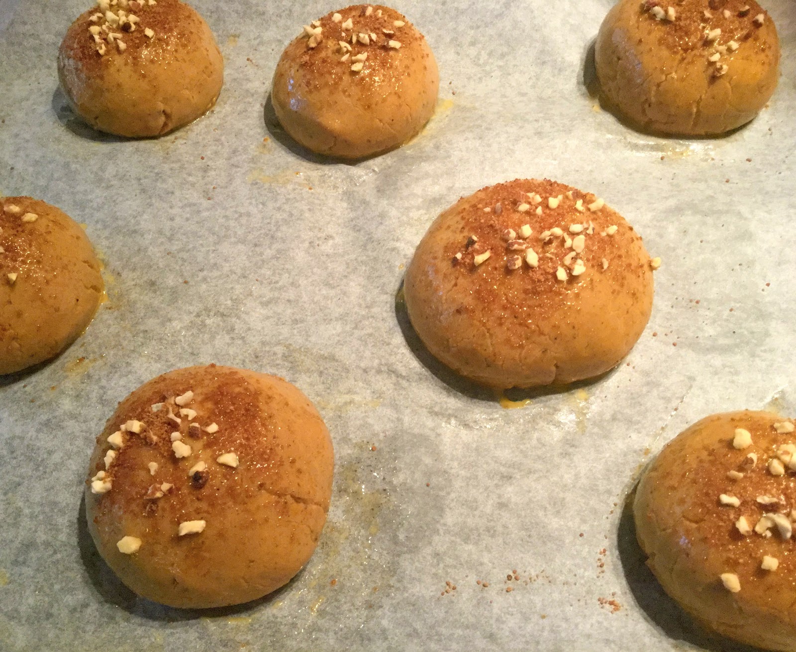 Peitä pelti liinalla ja anna pullien kohota ainakin 60 minuuttia, tai jopa hetken pidempään. Voitele kohoamisen jälkeen lämpimällä kasvimaidon ja kookossokerin sekoituksella (1dl kasvimaitoa + 1rkl kookossokeria) ja ripottele pinnalle mantelirouhetta sekä himpun verran kookossokeria, jos haluat.