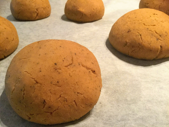 Pyörittele paloista tasaisia, pyöreitä pullia, ja asettele ne uunipellille leivinpaperin päälle.
