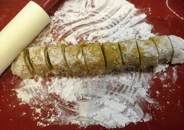 Kumoa taikina leivonta-alustalle ja muotoile pitkäksi tasapaksuksi pötkyläksi. Taikinan pitäisi olla helposti käsiteltävää, mutta edelleen joustavaa. Leikkaa pötkylä saman suuruisiksi paloiksi.