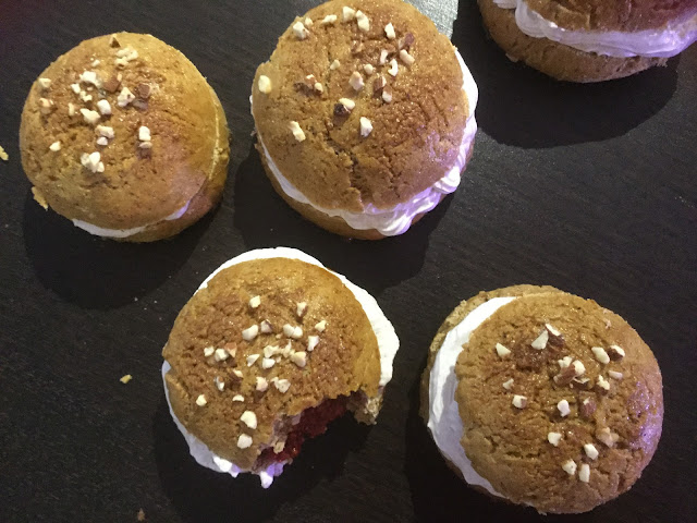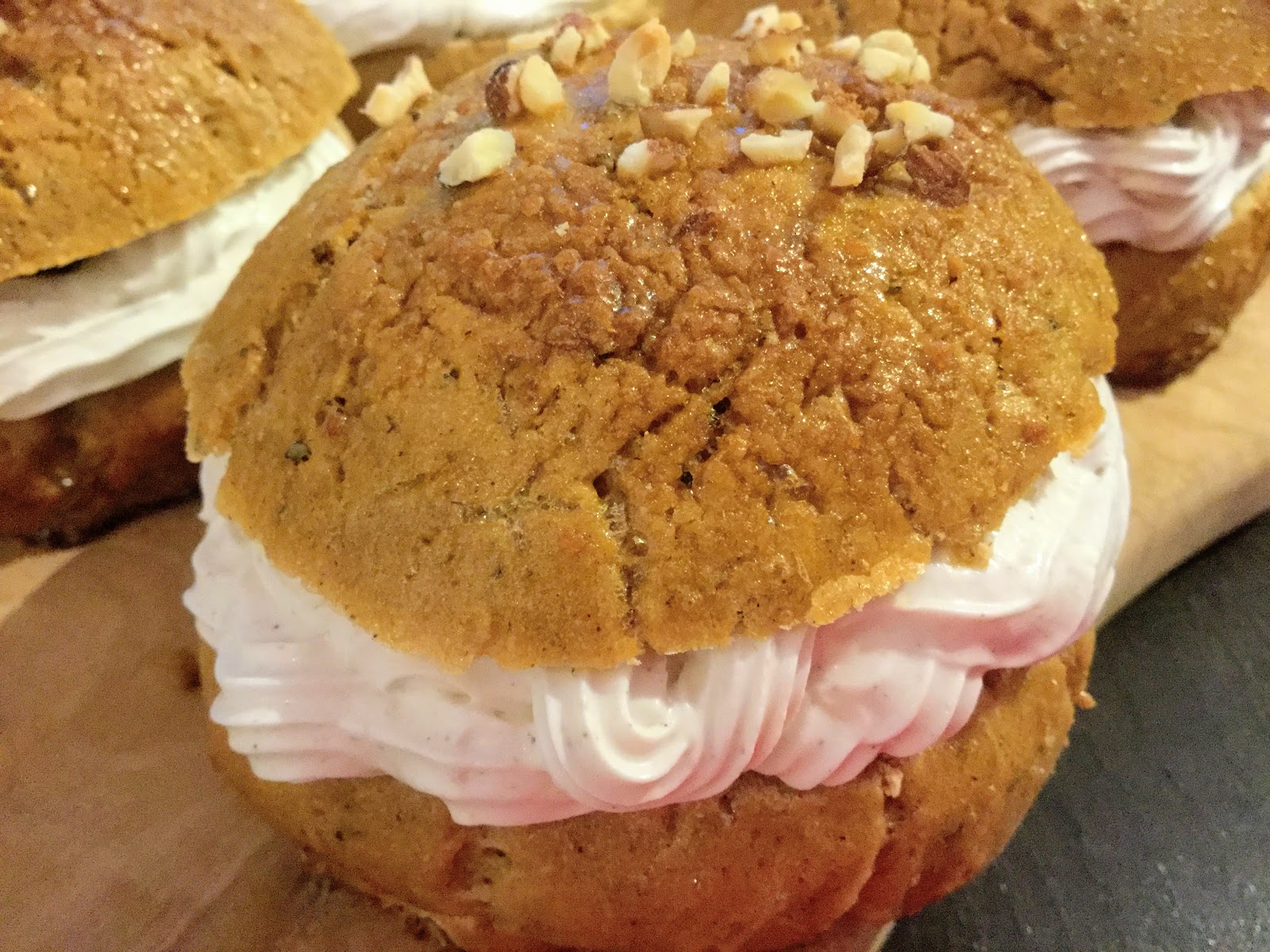 Vatkaa ainekset paksuksi kermavaahdoksi sähkövatkaimella. Laita kerma pursotinpussiin tai pakastepussiin ja pursota halkaistun pullan alimman puoliskon reunoille.