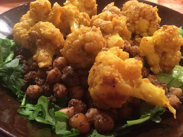 Tätä salaattia nautittiin eräänä synkkänä talvi-iltana, kun taivaalta satoi sekaisin vettä, räntää ja lunta. Vihreällä salaattipedillä tarjoiltavat lämpimät ja mausteiset kikherneet ja kukkakaali tekevät salaatista ruokaisan ja lämmittävän. Salaatti on nopea valmistaa, ja näin terveellistä iltapalaa on nopeasti edessä silloinkin kun siihen ei jaksaisi tai ehtisi panostaa.
