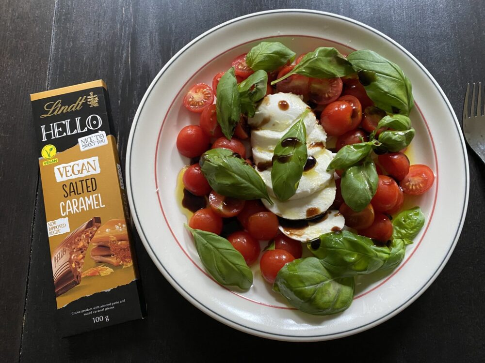 Kotona kävin pitkässä suihkussa, pistin kasvonaamion ja tein ihanan tomaatti-mozzarella salaatin, jollaista on tehnyt mieli pitkään. Sitten lempparisuklaata ja edellisen viikonlopun leffakäynnistä jääneet karkit matkaan, ja ihana pesä sohvalle. Katsoin Maxille tulleen leffan The Zone of Interest, mikä oli erittäin upea ja puhutteleva, joskaan ei aiheeltaan tietty mikään leppoisin elämys.
