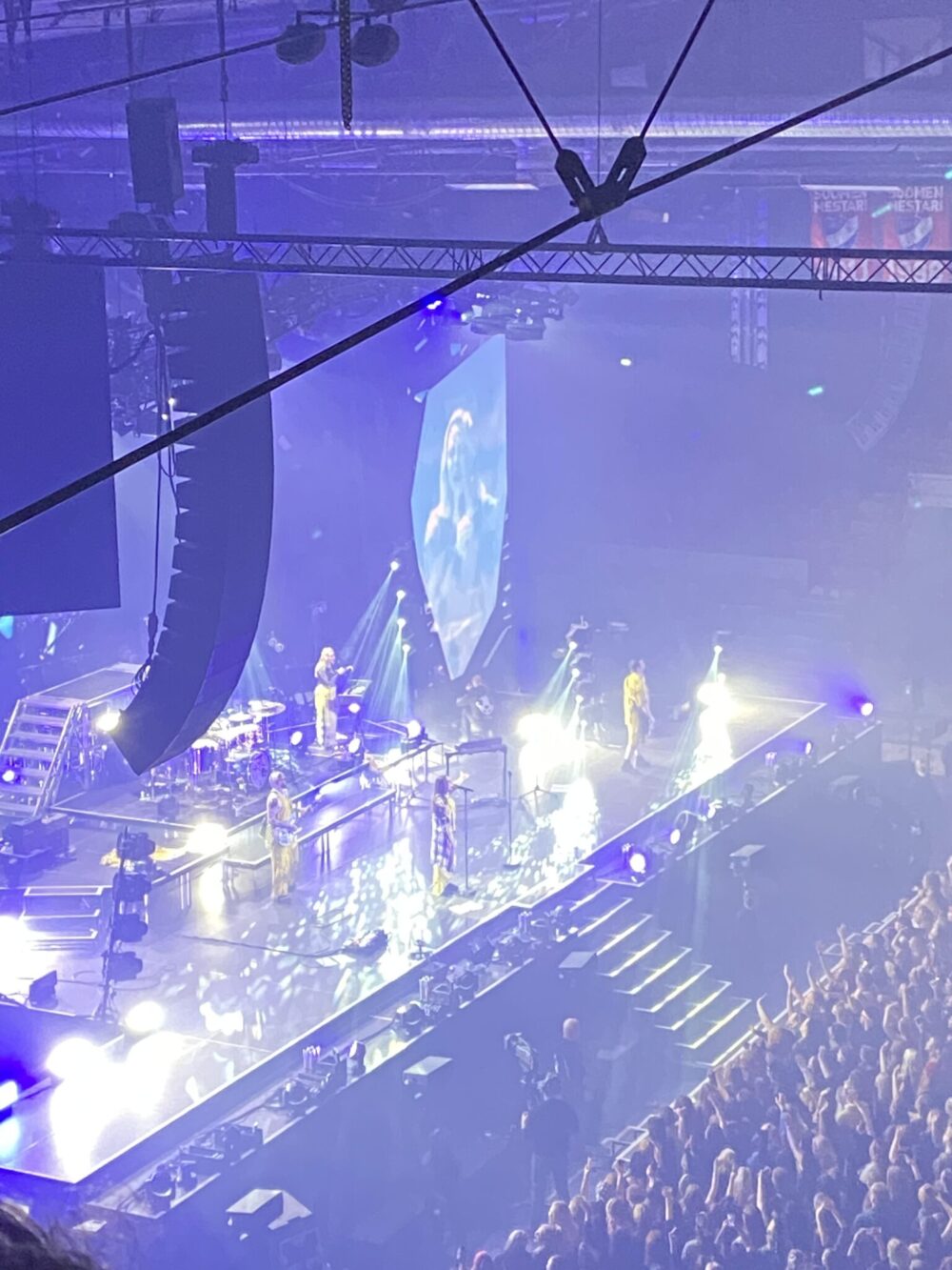 Teatterista jatkettiin toisenlaisiin tunnelmiin, kun vuorossa oli PMMP:n jäähallikeikka. Sinne mentiin kaverin ja lapsen kanssa. Mietin otanko naperon mukaan, mutta toisaalta tässä oli todennäköisesti viimeinen tilaisuus kokea tämä oman nuoruuden tärkeä bändi yhdessä. En olisi osannut kuvitella, että sellainen tilaisuus vielä tulee. Stadikan keikka alkoi liian myöhään, ja tämäkin siinä rajalla, mutta toisaalta uskon vankasti että avoimin mielin ja lapseen luottamalla mikä tahansa on mahdollista. Hän on tottunut kulkemaan matkassa mukana ihan joka paikassa. Niinpä hallilla ostettiin popparit ja pillimehu, ja mentiin nauttimaan keikasta.