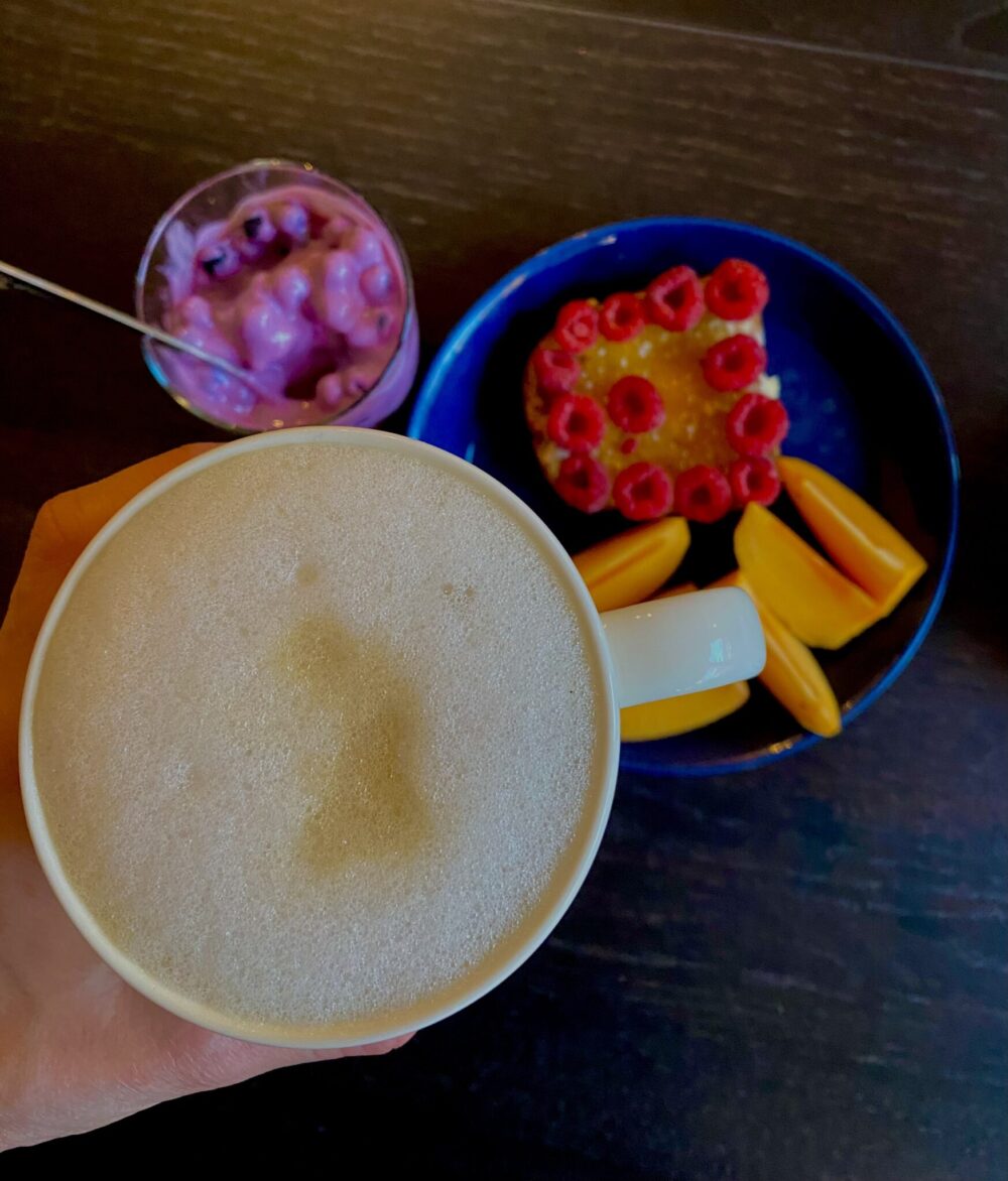 Kulttuuririentojen jälkeen lupasin skipata yhtenä aamuna puuron ja antaa lapsen tehdä meille aamupalaa. Paahtoleipää, appelsiinimarmeladia, jogurttia ja marjoja. Maistui ihanalta.