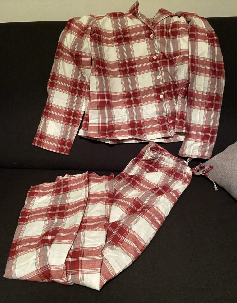 Mulla on ollut käytössä viimeiset 4 vuotta H&M vohvelikangas aamutakki, joten tein asian helpoksi ja tilasin uuden vastaavan eri värisenä. Ihanan ohut, pehmoinen ja mukava malli! Samalla tuli puuvillainen paita + housut -setti, jossa on valkoinen pitkähihainen trikoopaita ja valko-siniraidalliset täydellisen ohuet pöksyt. Lisäksi punainen ruutusetti, jossa on nappipaita. Ja tämähän on sellainen flanellipyjama, joita kammoan — paitsi ettei ole! Materiaali on tässäkin kiva ohut ja sileä, ei sellainen paksu karhea, kuten flanelli monesti on. Se on se joulupyjama, jonka pistän päälle ekaa kertaa vasta juurikin jouluna!
