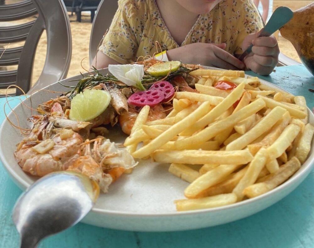 Kyllä Sri Lankassa herkuttelemaan pääsee, etenkin, jos tykkää merenelävistä ja pyytää lisää potkua ruokiin. Omat lempparit olivat aamupalalla syödyt munahopperit, ne kookosletut, kasviscurryista ihana leafy greens ja chiliperunat sekä prawns tapenade. Ainoastaan yksi ruoka oli pahaa, ja siitä hetken ajattelin jo mahataudin iskevän. Tilattiin lapselle grillattua mustekalaa, ja ilman sitä voikastiketta annos maistui kaikkea muuta kuin tuoreelta mustekalalta. Jätettiin syömättä, eikä yhden maistiaisen jälkeen onneksi tullut ongelmia. Joten yhteenvetona: hyvää, edullista ja runsasta, mutta pidemmän päälle kyllästyttävää.