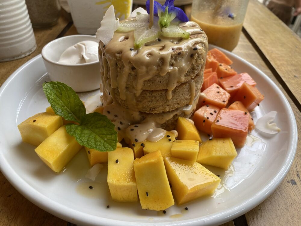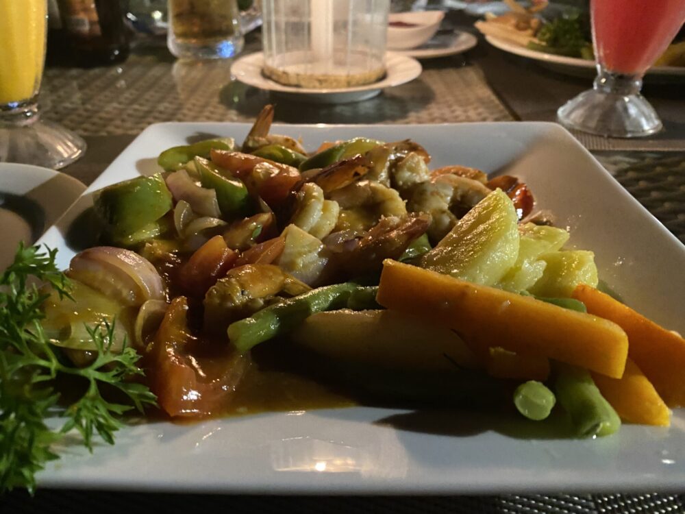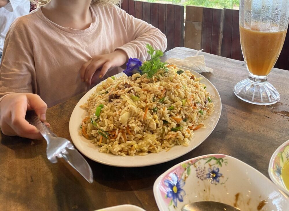Oli ihana huomata miten lapsi tottui kahdessa viikossa ihan uusiin makuihin ja annoksiin, eikä vetänyt pelkkää hampurilaista. Ranskalaisia oli joka tapauksessa lisukkeena aika monessa annoksessa. Jonkun kerran annos oli hänen mielestään liian tulinen, ja myönnyin putsaamaan ravuista kastiketta parhaani mukaan pois. Viidakkoretkeltä löydettiin kookosletut, jotka oli tehty maissijauhosta ja täytetty kookoksen ja hunajan sekoituksella. Vegaaniset banaaniletut tuli myös maisteltua pariin kertaan. Smoothiekulhot sen sijaan jäivät väliin, koska syötiin aamupalat hotellilla enkä ikinä muiden annosten jälkeen jaksanut niitä.