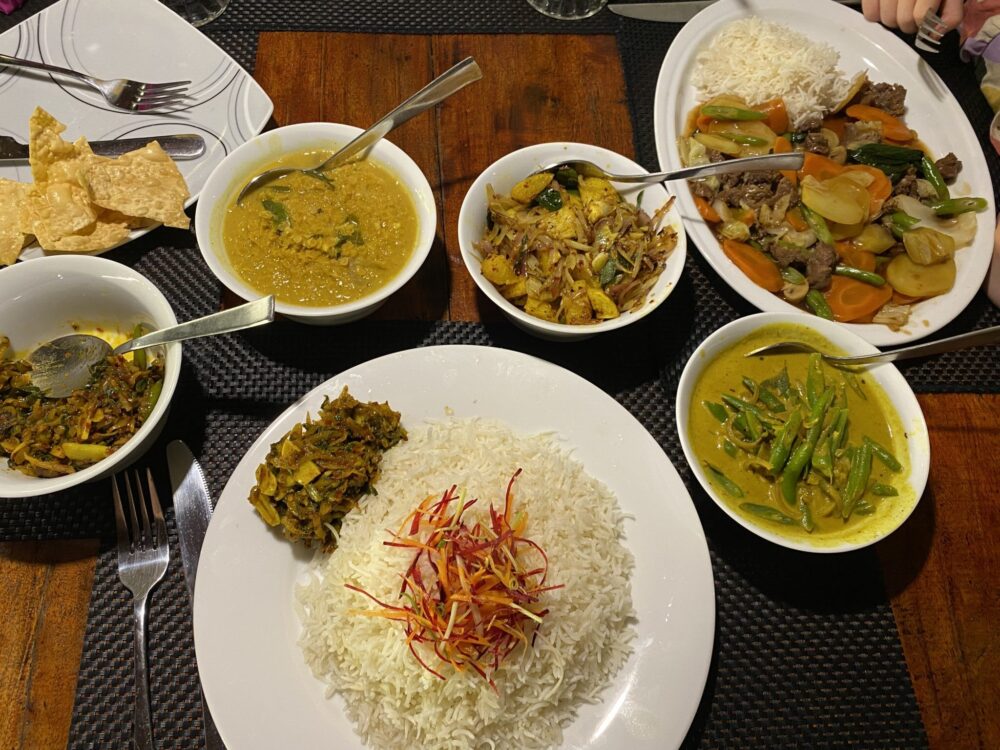 Täytyy sanoa, ettei tee mieli riisiä hetkeen. Se oli kiva, että lapsikin oppi syömään riisiä, mitä ei ole aiemmin oikein mennyt. Rice & currya tuli syötyä useaan kertaan, ja etenkin kasviscurryt oli tosi hyviä. Erilaisiin kasvislisukkeisiin oli saatu mielettömän hyviä makuja. Prawnseja söin joka päivä, ja ihania mehuja papaijasta ja mangosta. Aamupalalla syötiin paikallisia aamiaislettuja eli hoppereita. Annokset oli valtavia.