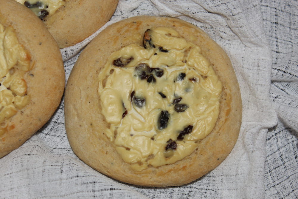 Lusikoi rahkatäytettä pullien keskelle. Peitä pelti liinalla ja anna pullien kohota lämpimässä paikassa tunnin ajan.