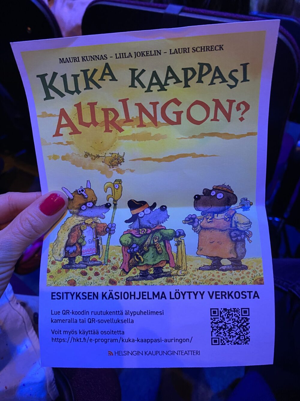 Kuka kaappasi auringon? kestää noin kaksi tuntia väliaikoineen ja sitä suositellaan yli viisivuotiaille. Ehkä itse koin tämän selvästi pienemmille suunnattuna muiden viime vuosien näytelmien jälkeen, mutta tiedän monia omaa lasta pienempiä naperoita, joihin tämä olisi uponnut hyvin. Mainio valinta siis koko perheen teatterihetkeen. On ilo huomata, että Helsingin Kaupunginteatteri tekee täyspitkiä ja visuaalisesti viimeisteltyjä esityksiä myös lapsille. Tällaiset teokset antavat nuorille katsojille mahdollisuuden kokea teatterin taikaa aidosti – musiikin, tarinan ja esiintyjien yhteispelinä.