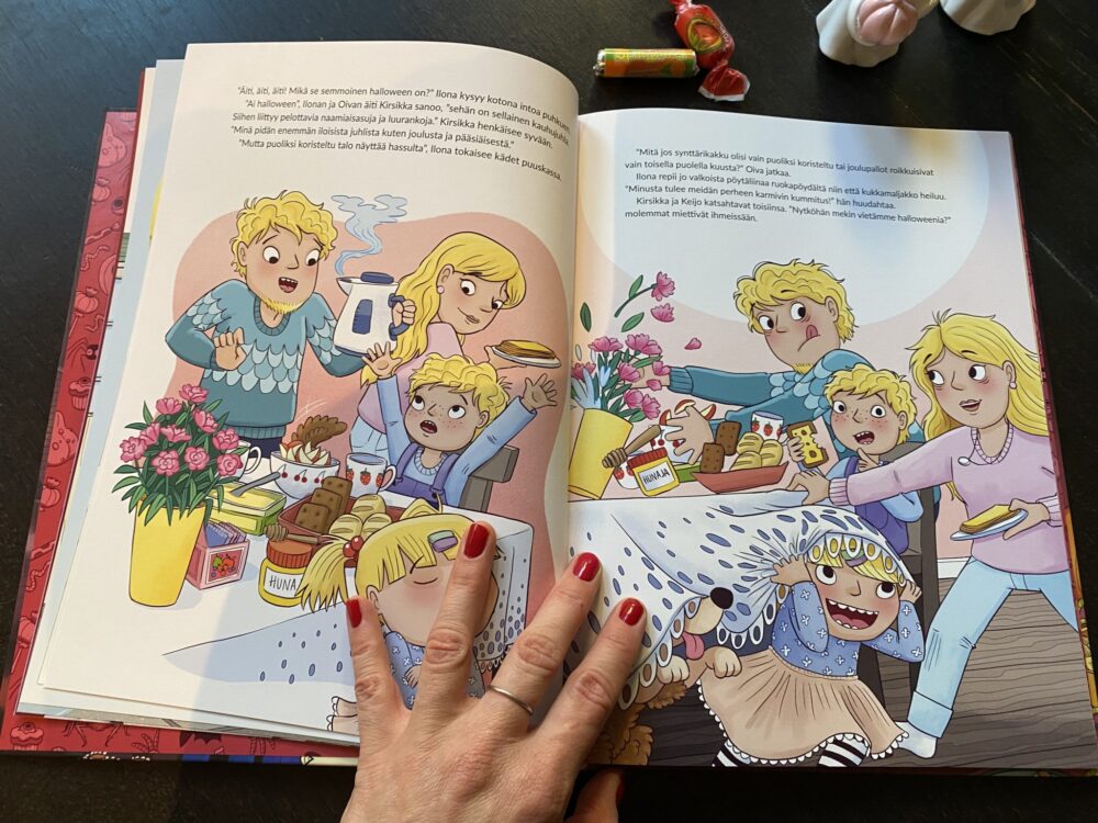 Kirjassa tutustutaan hauskan tarinan kautta siihen, mitä halloween oikeastaan on: mikä on kammokuja, mitä tarkoittaa “karkki vai kepponen” ja miten juhlaa voi viettää omalla tavallaan. Kun uudet ystävykset suunnittelevat yhdessä hurjaa juhlaa, myös lukija saa paljon ideoita ja inspiraatiota omaan halloweenin viettoon pienellä tai isommallakin panoksella. Tarina on herttaisen yksinkertainen, mutta juuri siksi se toimii niin hyvin: se on helposti seurattava ja sopii mainiosti pienemmillekin lukijoille. Meidän lapsi tykkäsi siitä kovasti ja innostui lopussa olevista leipomisvinkeistä. Kuulemma tänä vuonna kun vietetään halloween-teemaisia synttäreitä sitten joulukuussa.