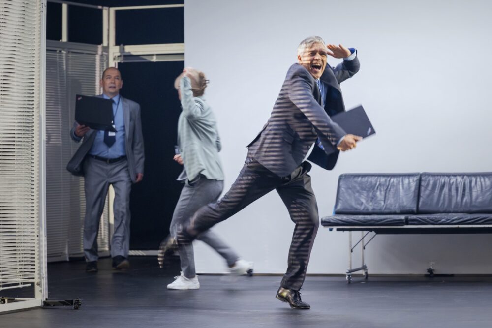 Siirtymät maailmasta toiseen, liikkuva lava ja työyhteisön yhteiset jortsuvartin tanssihetket tekevät kohtauksista todellista lavaherkkua – hetkiä, joissa työelämän absurditeetti muuttuu taiteeksi, ja taide paljastaa jotain hyvin inhimillistä työn todellisuudesta.