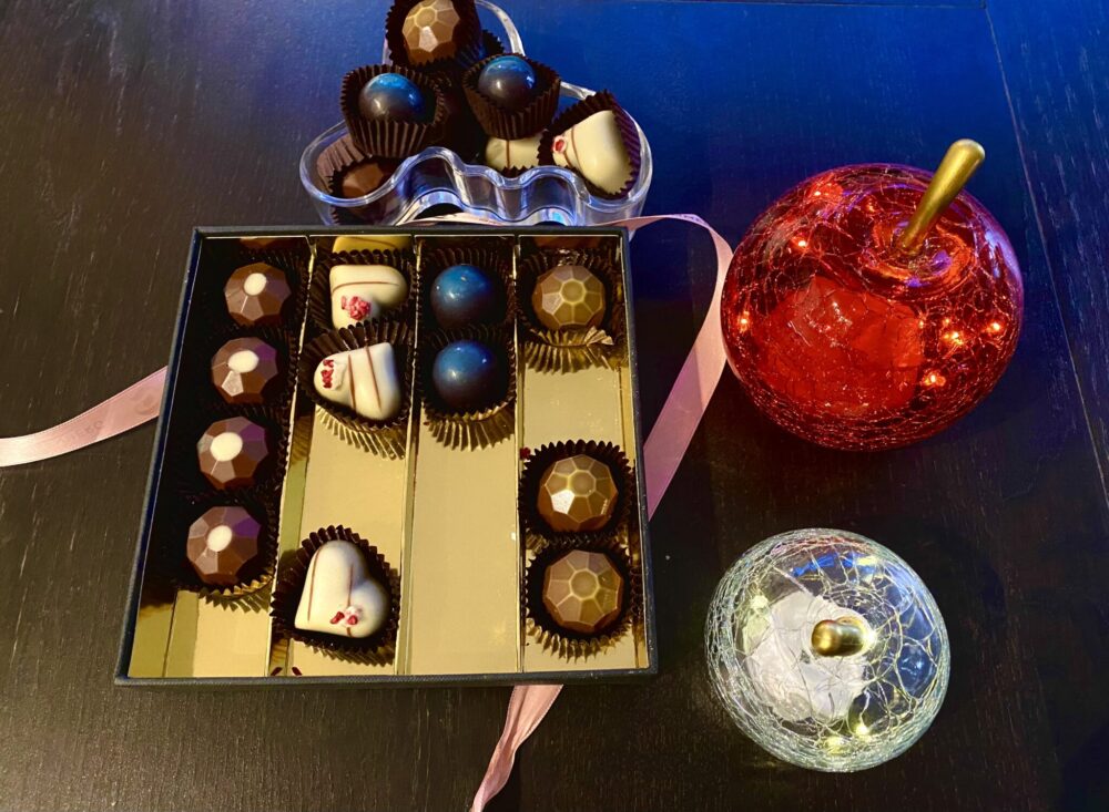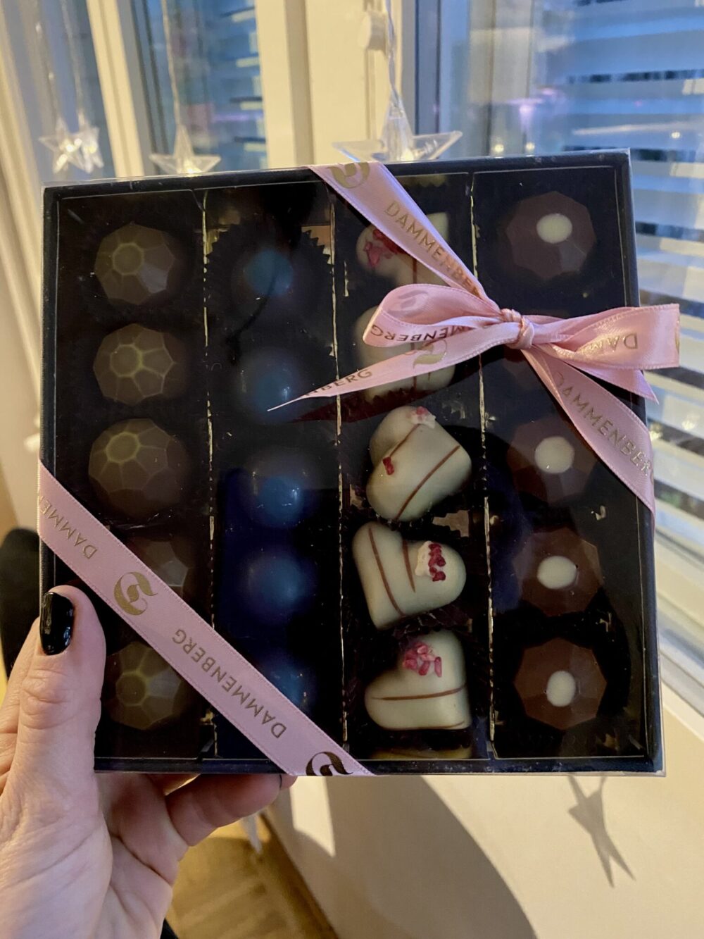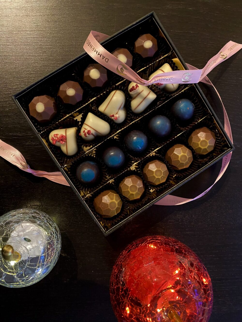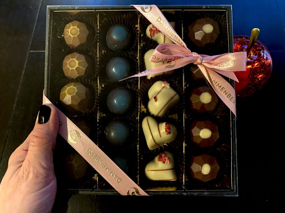 Sain Dammenbergilta maisteltavaksi käsityönä tehdyn konvehtirasian, ja täytyy sanoa: tällaiselle suklaahullulle se on yhtä juhlaa. Konvehdit ovat paitsi kauniita ja koristeellisia, myös täysin pähkinättömiä, gluteenittomia, kananmunattomia, vegaanisia, maidottomia, laktoosittomia, soijattomia, vanilijattomia ja GMO-vapaita. Ton-ton-listasta huolimatta ne ovat kaikkea muuta kuin mauttomia – näin hyviä konvehteja saa harvoin!