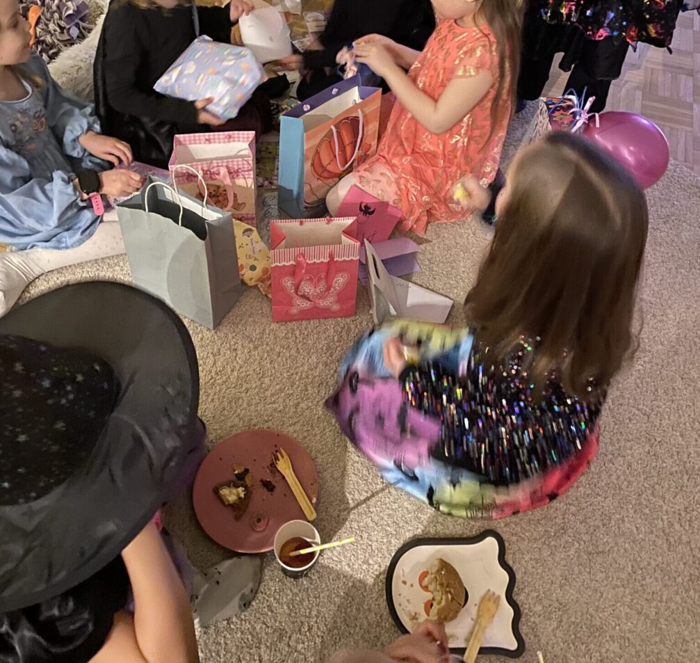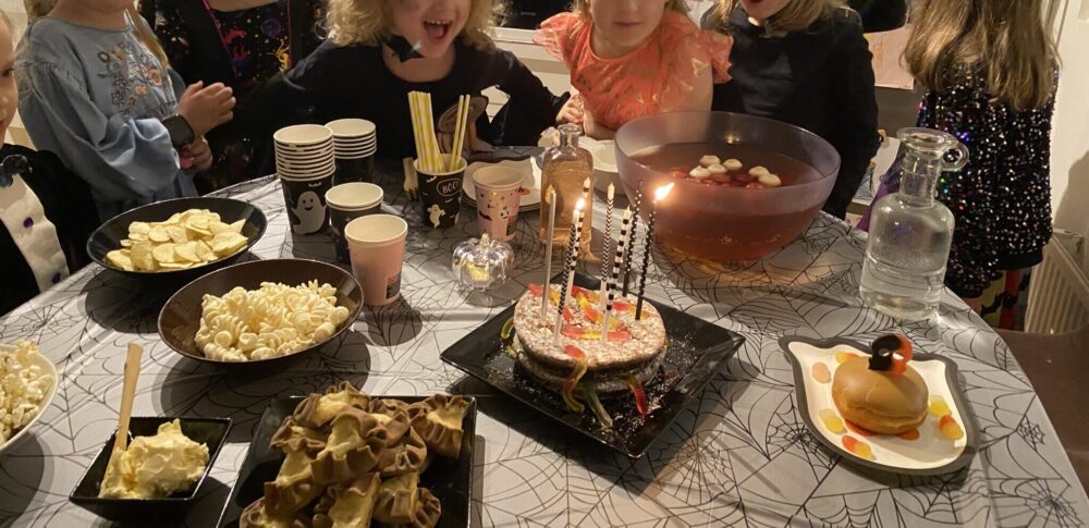 Juhlaviikonloppu alkoi perjantaina koulun jälkeen kaverisynttäreillä. Kymmenen lasta, reilut kaksi tuntia ja yllättävän sujuva kokonaisuus. Tällä kertaa aika meni jopa liian nopeasti. Ohjelmana oli DIY-slime, mikä oli pieni riskinotto ottaen huomioon oman limavastaisuuteni, mutta setti toimi: jauheet, glitterit ja purkit olivat helppoja ja jokainen sai oman tuotoksensa mukaan. Halloween- ja lepakkoteema näkyi koristeissa, ja tehtiin työhuoneesta ”kammohuone”, missä soi karmiva musiikki ja pimeässä piileskeli erilaisia lepakoita ja muita kammotuksia.