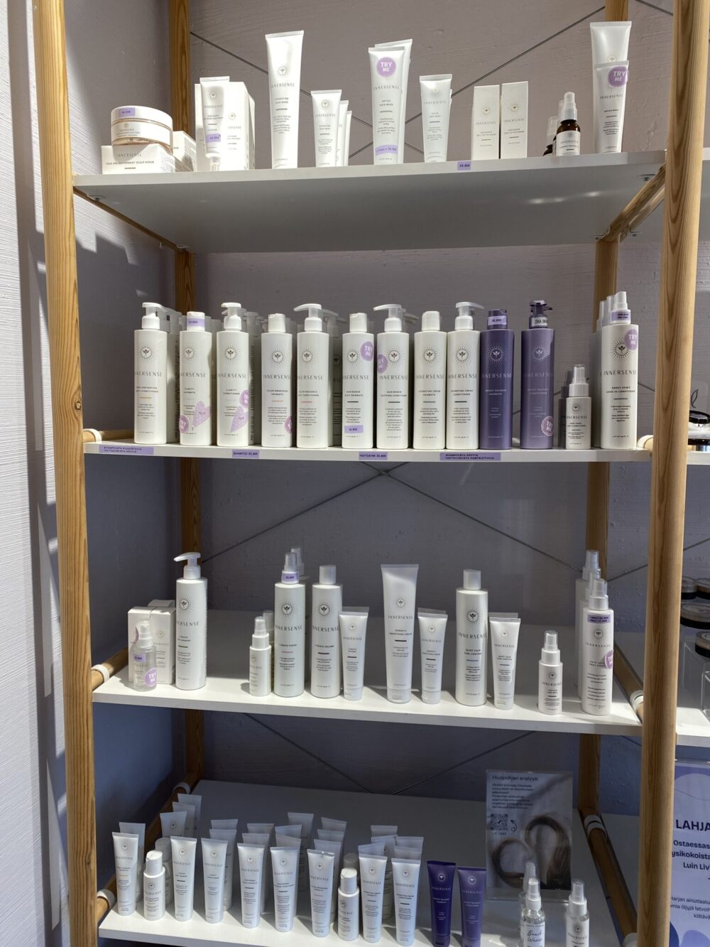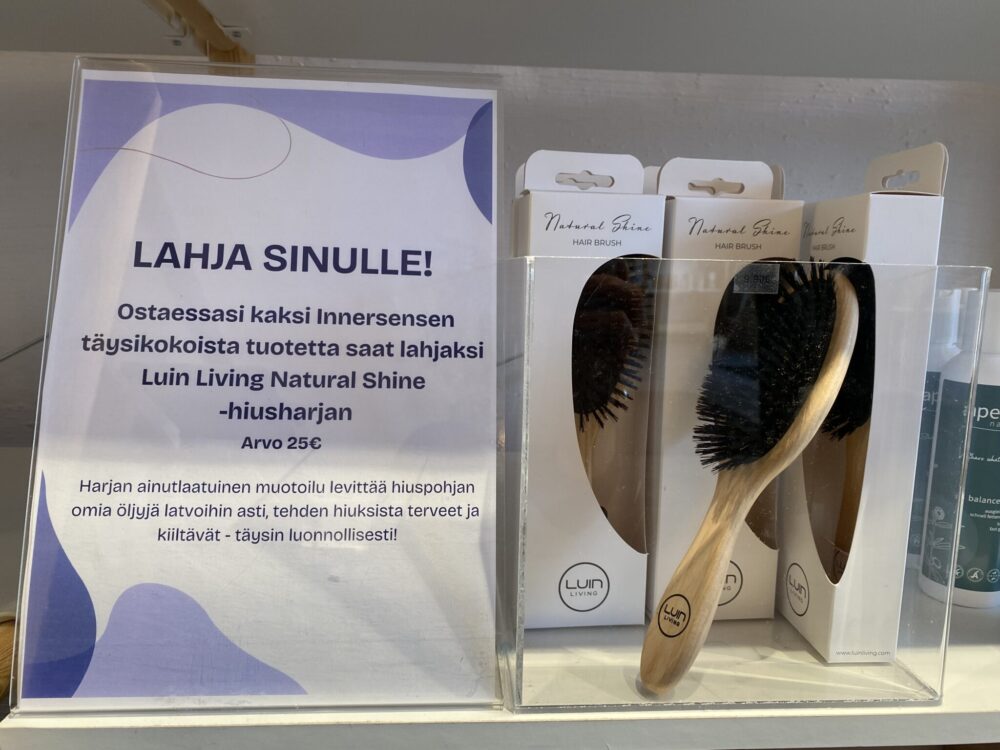 Analyysin jälkeen ostin käyttöön nestemäisen hiuspohjan kuorinnan, hiuksiin jätettävän hoitosuihkeen, suolasuihkeen ja hiusöljyn. Kaupan päälle sai uuden hiusharjan ja vihkon, johon oli kirjattu mukaan hoito-ohjeet ja hiuspohjan analyysin tulokset. Ennestään mulla on ollut jo käytössä Innersensen hair renew -shampoo ja hoitoaine.