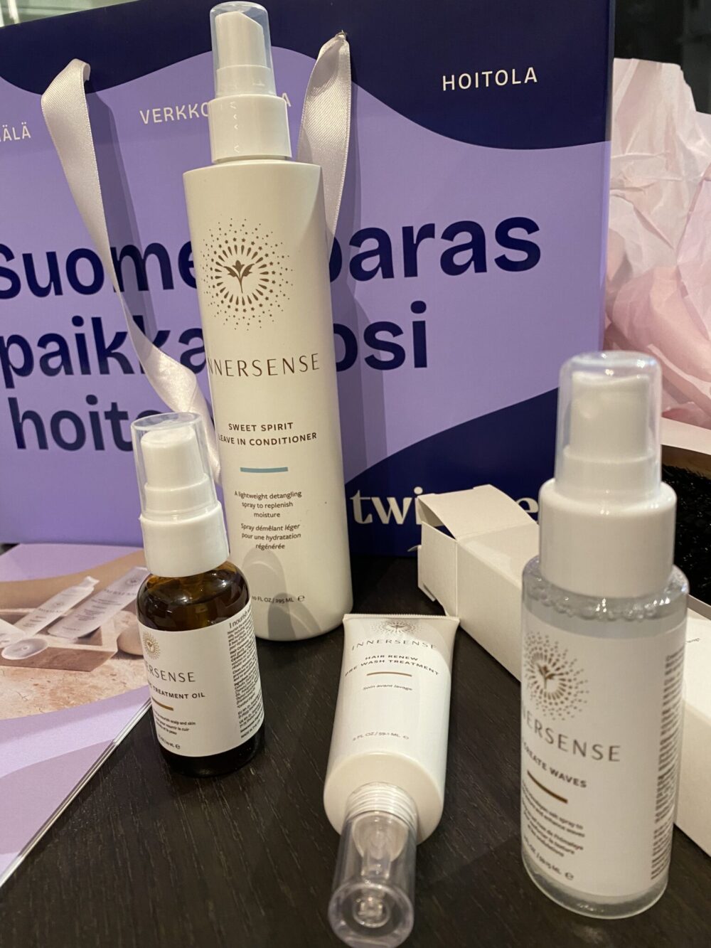 Pääsin testaamaan Twistben hoitolassa Innersense-laitteella tehtävässä hiuspohjan analyysissä, jossa kartoitettiin hiuspohjan tilaa ja valittiin juuri mulle sopivat hiustenhoitotuotteet. Sama shampoo ja hoitoaine olikin jo Innersenseltä käytössä, ja nyt otin vielä kokeiluun erilaisia hoitavia ja muotoilevia tuotteita.