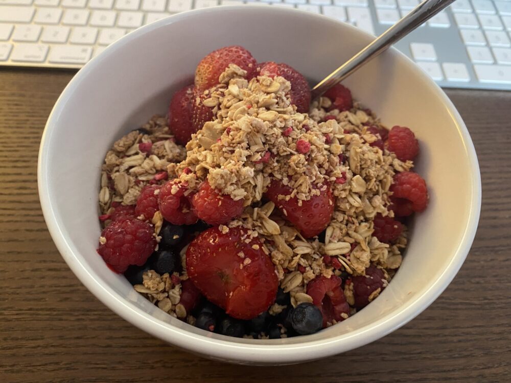 Tuttuun tapaan aamupalaksi puuroa. Ihana, pitkään kauramaidossa haudutettu kaurapuuro – ah! En sitten kyllästy ikinä. Päälle mantelitahnaa, mansikkahilloa, marjoja ja Foodinin granolaa. Oheen kuppi kahvia vaahdotetulla kauramaidolla (tällä hetkellä vuorossa Oatlyn uutuus Churros-maku) ja itse leivottu suklaakeksi, koska pakko. Tällä setillä alkaa noin 9/10 aamua. Ja hyvin alkaakin.