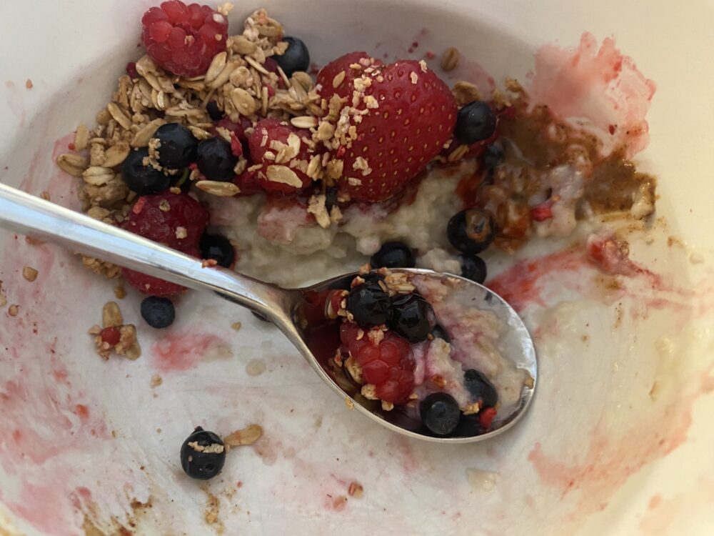 Aamupalaksi piti itse asiassa syödä bageli, kun niitä tuoreena oli, mutta aamuhorroksessa se unohtui ja aloin rutiininomaisesti tehdä puuroa.