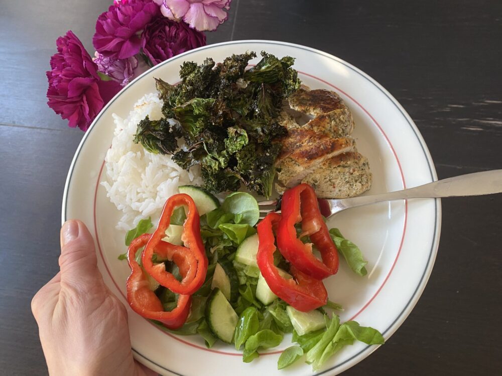 Lounaaksi chimichurrikanaa, riisiä, lehtikaalisipsejä ja salaattia oliiviöljyllä.