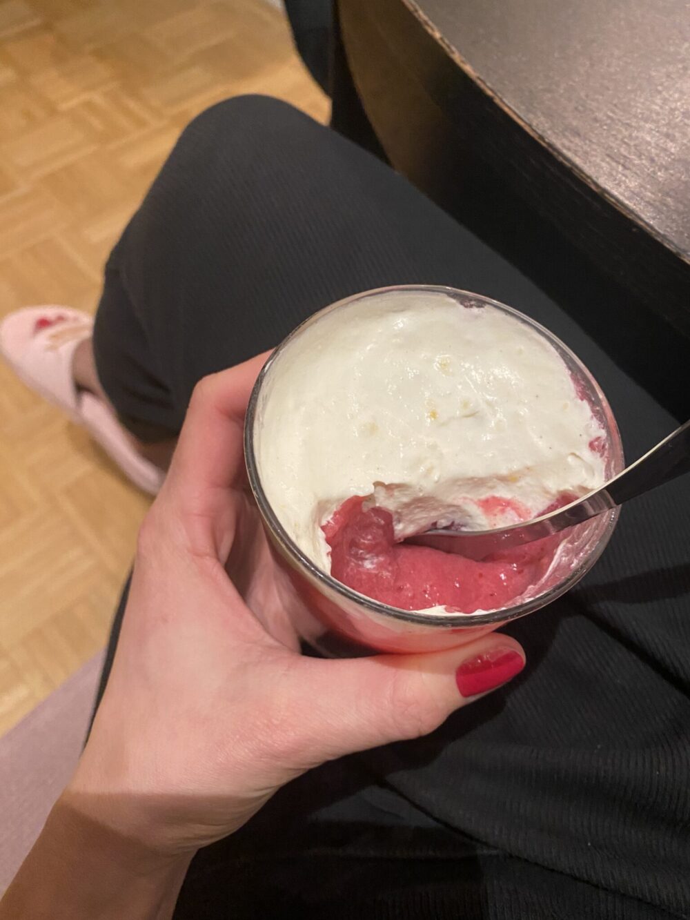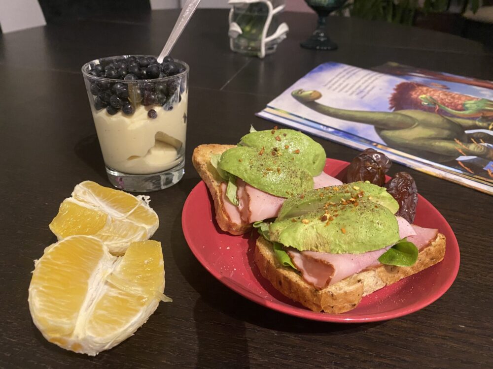 Päivällisaika meni töiden jälkeisessä kuntosalijumpassa, ja koiran lenkittämisen ja lapsen iltapuuhien jälkeen seuraava ruoka oli iltapala: pari palaa leipää (tällä kertaa avokadolla), hedelmää, medjool-taateleita ja Alpron Go-onia marjoilla. Näiden jälkeen tuli vielä myöhemmin otettua tuohon samaan lasiin itsetehtyä pistaasijätskiä ja reilu pala Goodion raakasuklaata.