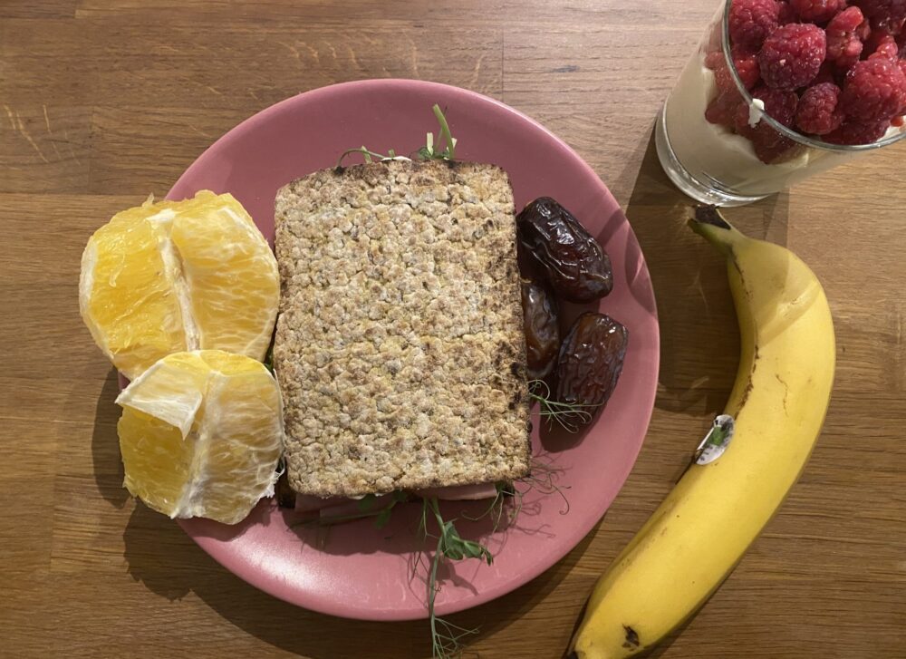 Iltapalaksi ihan mun lempileipää eli Ullan Pakari porkkana-kauraleipää lisukkeilla, Alpron Go-onia marjoilla, appelsiini ja banaani sekä muutama taateli.