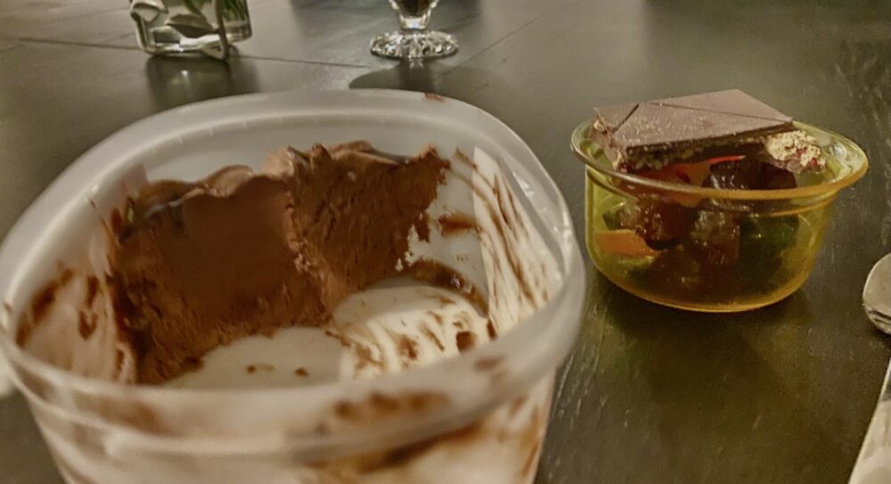 Uppouduin Bridgertonin uuden kauden jaksoihin ja otin vielä oheen rasian loput Ainon vegaanisesta suklaajäätelöstä ja karkkilaatikossa olevia karkkeja ja Pandan appelsiinikrokanttisuklaita, mitä on jäänyt joululta. Ehkä muutama suklaa liikaa (ei näy kuvassa), kun sitten iski hirveä jano, mutta olipa hyviä, vaikka äärimmäisen huono kuva.