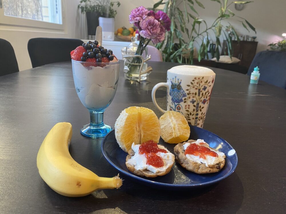 Poikkeuksellisesti olin yksin kotona naperon ollessa isovanhemmilla yökylässä. Ja tavanomaisesta poiketen aamupalaksi oli jotain muuta kuin puuroa: kaneli-rusinabagel Mö tuorejuustolla ja mansikkahillolla, appelsiini, Alpron mansikka Go-onia marjoilla ja kahvia. Kuvassa myös banaani, jota en sitten jaksanutkaan. Ja taas täytyi todeta että ei toiminut yhtä hyvin kuin puuro.
