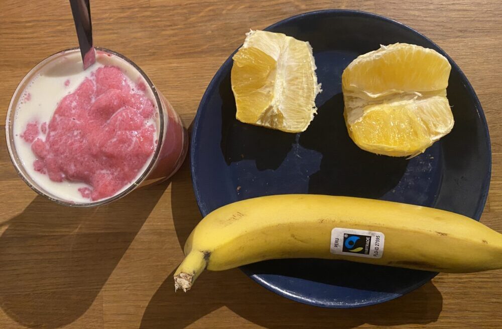 Iltapalaksi vielä vispipuuroa Oddlygoodin salted caramel -baristalla, appelsiini ja banaani.