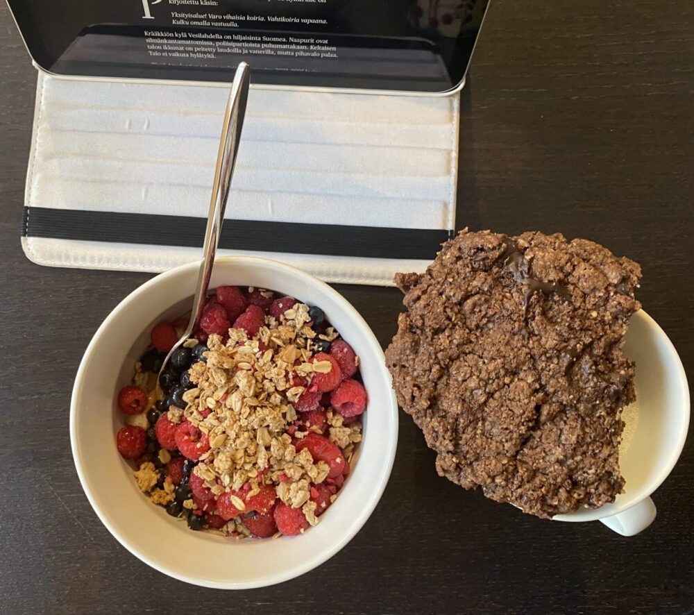 Tänään taas aamiaispuuro ja lauantaina leivottu tuore suklaakeksi. Ja ohessa taas kahvia. En ole niitä, jotka litkivät kahvia pitkin päivää, mutta se aamukahvi on lähes terapeuttinen.