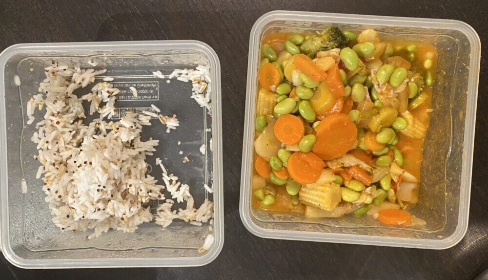 Lounaaksi oli wokkia ja riisi-kvinoa-kauraseosta aika helpolla kaavalla. Valmis hapanimeläkastike ja sekaan wokkivihanneksia, edamamepapuja ja Muu kanatonta viillokkia. Kuvassa ei niinkään annos, vaan jääkaappiin päätyneet jämät.