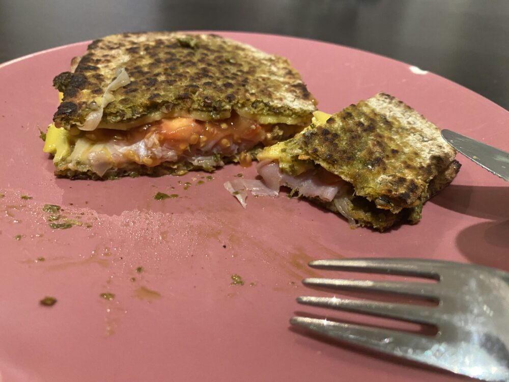 Päivällinen jäi välistä, kun lounas oli myöhäinen ja sitten olin koiran kanssa ulkona kuuteen saakka. Iltapalaksi vähän täyttävämpää satsia: kahden kaurarieskan väliin vegejuustoa, vegepestoa, ilmakuivattua kinkkua ja tomaattia, ja pannulla paisto lämpimäksi. Lisäksi vähän tuoretta mangoa, annos vispipuuroa kermavaahdolla ja vielä banaani ja muutama taateli.