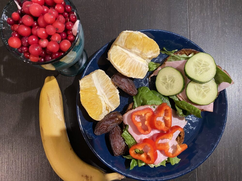 Kaurarieskaa vihanneksilla ja kinkulla, appelsiini, banaani, Alpron mango Go-onia marjoilla ja taateleita.
