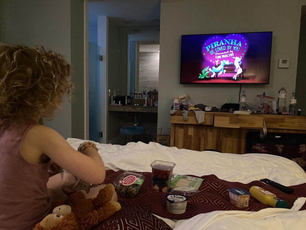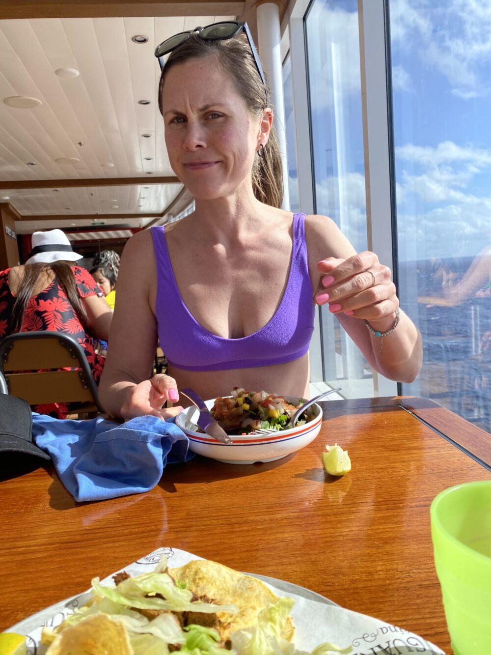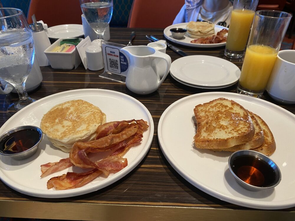 Ravintolan aamupalalista oli varsin hyvä, ja aamiainen maistui. Olen aina tykännyt aamiaisbuffasta, mutta en usko että tällä laivalla olisi ollut helppoa löytää meille sopivaa. On rasittavaa joutua pyytämään joka aamu erikseen. Esimerkiksi Persianlahdella gluteenittomia löytyi valikoimasta aina valmiiksi. Nyt napero söi oikeastaan joka aamu french toastia vaahterasiirapilla ja hillolla sekä hedelmiä. Itse kokeilin pannareita, french toastia, avokadotoastia ja munakasta. Kaikki oli tosi hyviä, ja oheen tilattiin pekonia ja hedelmiä. Kahviin löytyi kaurajuomaa ja henkilökunta teki muutenkin parhaansa saadakseen meille toivomiamme vaihtoehtoja.
