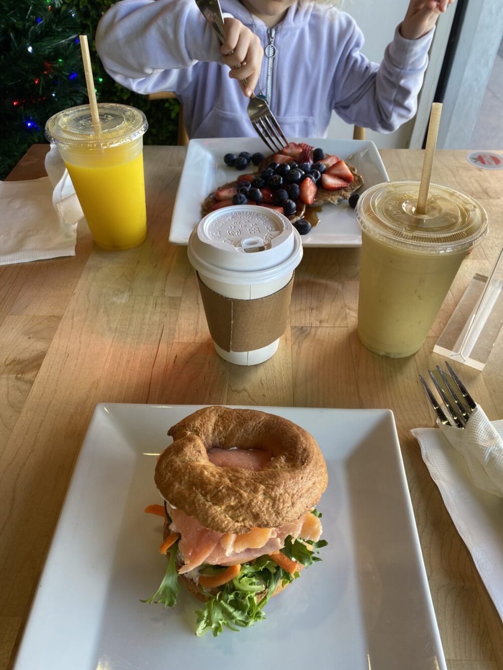 Vielä parempi oli kuitenkin söpö Apple a Day Cafe, mikä oli kuin meille tehty. Lapsi sai koko reissun suosikkiaamupalan (amerikkalaiset peruspannarit oli kuulemma pahoja, mutta näihin ihastui) ja itsellä oli ihan vaikeuksia valita mitä tilaa, kun ihania vaihtoehtoja oli niin paljon. Lohitäytteinen bagel oli super hyvää.