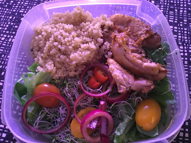 Tämä kana-kvinoasalaatti on paitsi erittäin maukas, myös ravitseva ja tasapainoinen ateria. Se toimii kylmänä ja lämpimänä. Helppo pakata mukaan, kuten kuvasta näkyy. Ainekset voi kasata trendikkääksi salaattibowliksi, tai antaa mennä reteästi sekaisin. Halutessaan joukkoon voi lisätä esimerkiksi pannulla paistettua vuohenjuustoa tai halloumia, mitä löytyy muuten myös lampaanmaitoon tehtynä. Tällä kertaa jäi minulta pois, mutta suosittelen lämpimästi.