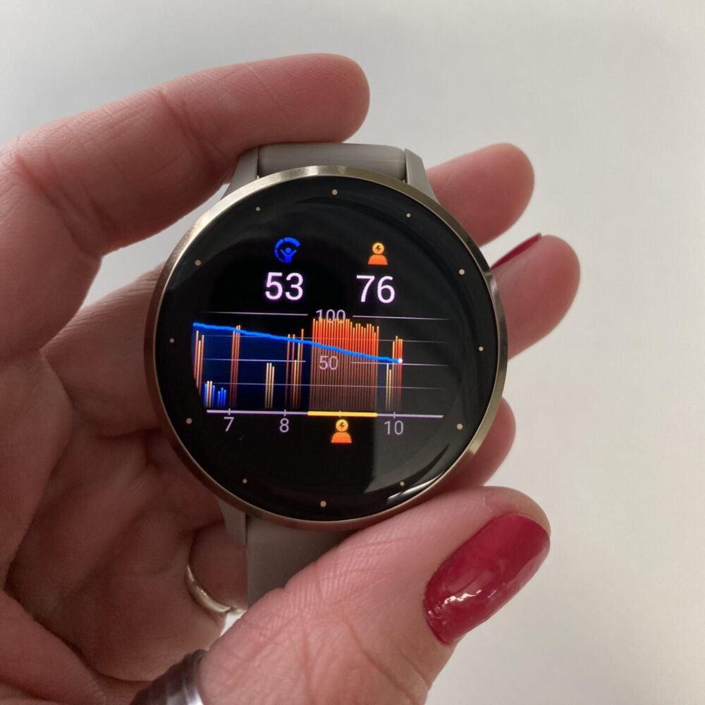 Venu 3S tarjoaa monipuolisia ominaisuuksia aina herätyksestä treenien tallennukseen ja seurantaan. Se antaa palautetta unesta, aktiivisuudesta ja ennen kaikkea palautumisesta, mikä onkin suurin ero aiempaan Polariin ja samalla se juttu, mistä tykkään Garminissa eniten. Siinä, missä Polar toimi periaatteella liiku aina vaan entistä enemmän että saat sen 100 % täyteen, Garmin kannustaa palautumaan. Se toimii Body Battery -periaatteella, eli seuraa miten kehossa on virtaa ja jaksamista päivän menoihin. Jos Body Batteryn taso on matala vaikka heikosti nukutun yön jälkeen, se kannustaa lepäämään ja keräämään voimia. Se ei välttämättä tarkoita pelkästään sohvalla makaamista, vaan ennen kaikkea stressin säätelyä ja rauhoittumista. Siihen voi hyvin kuulua esimerkiksi rauhallinen kävely tai joogahetki.