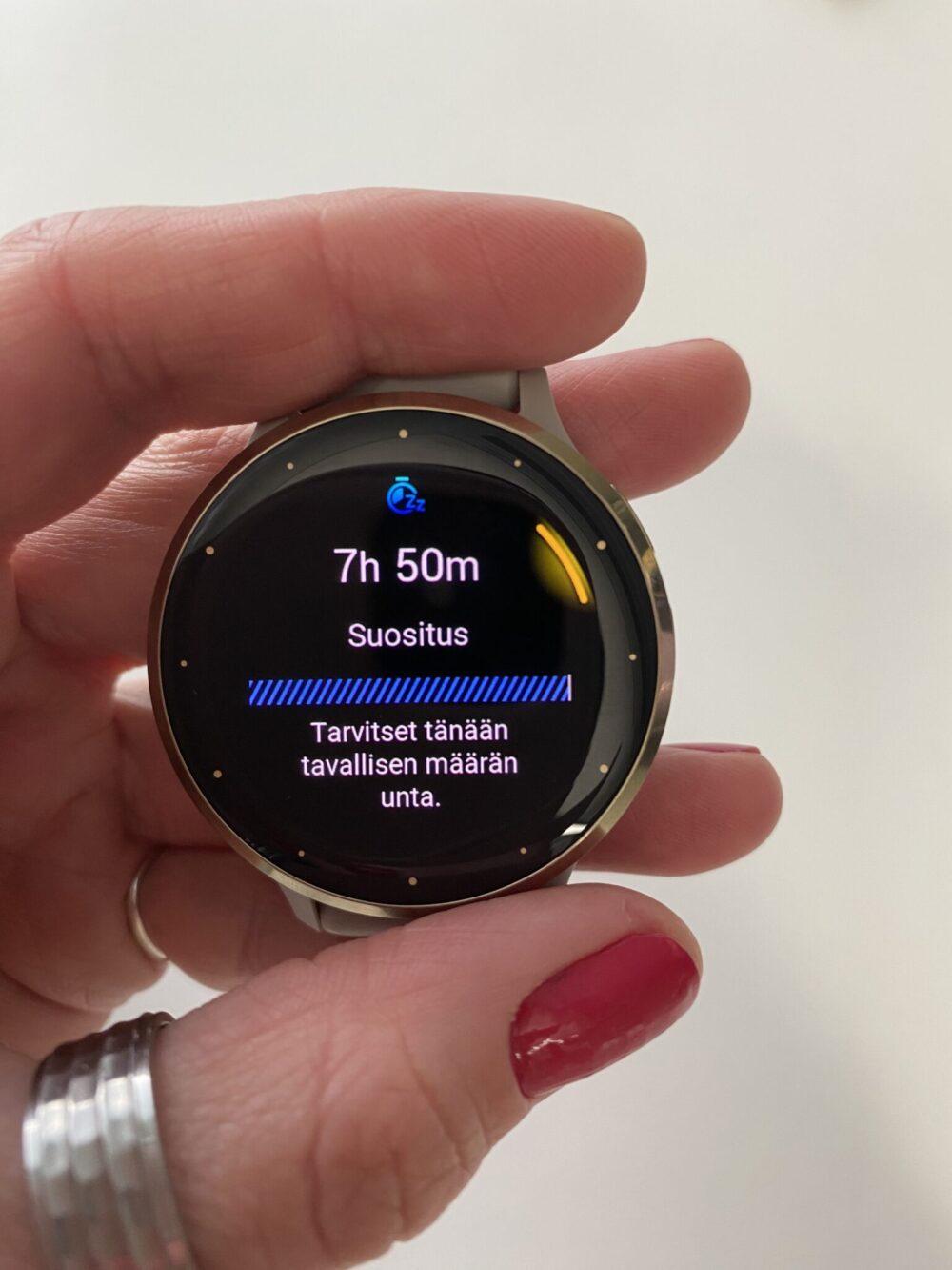 Garminissa kellonäytön saa tuunata mieleisekseen ja muutenkin pistää asetuksia juuri itselle sopivaksi. Aamuisin se antaa raportin niistä asioista, jotka itse raporttiin haluaa lisätä. Itselläni siinä näkyy muun muassa Body Batteryn taso, syke, stressitaso, univalmentaja, säätiedot ja kalenteri, ainakin. Kellon saa yön ajaksi pimeäksi ja hiljaiselle, ja siinä on myös oma mittari mahdollisille nokosille, mikä on ihanaa! Ei sinänsä, kertaakaan en ole päiväunia tullut sen kanssa nukkuneeksi.