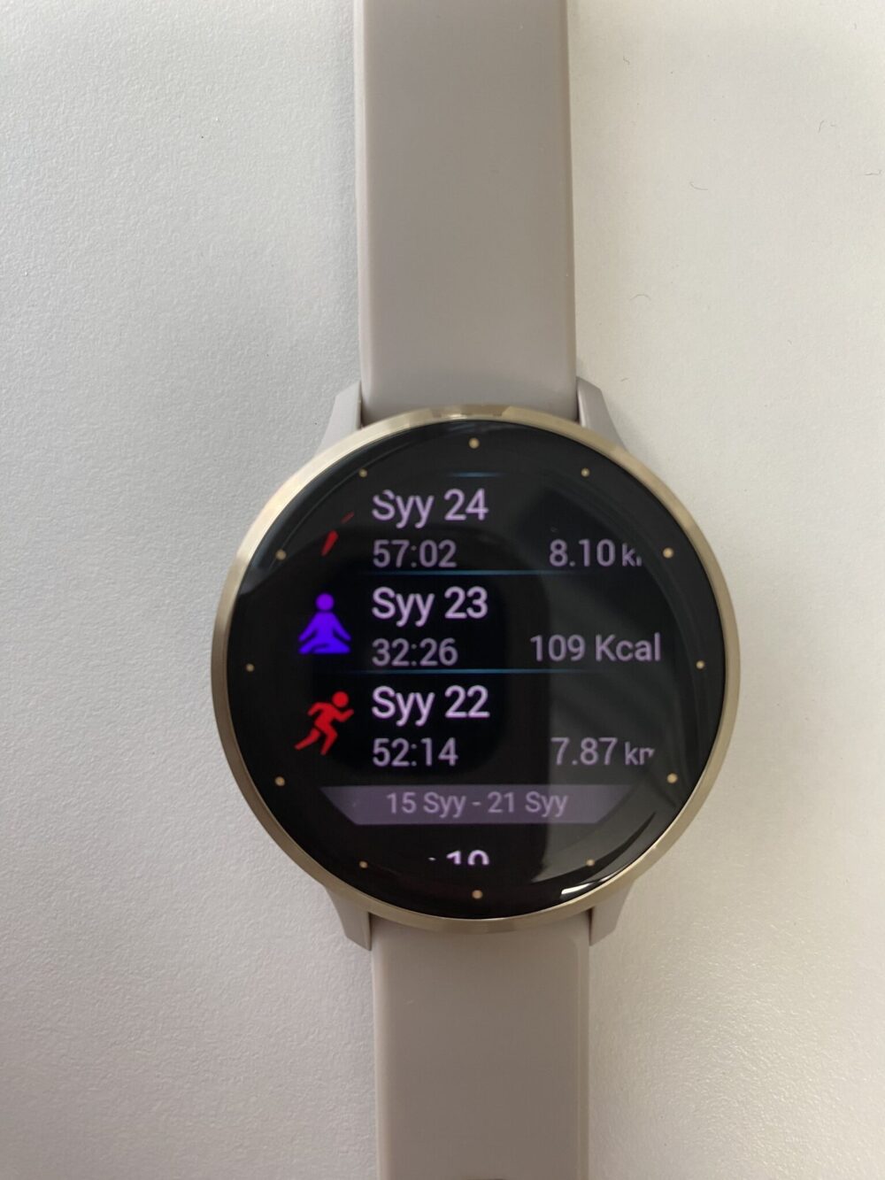 Sain kellon vain viikkoja lapsen syntymän jälkeen, ja äitiyslomalla tuli liikuttua paljon. Kolmostaso tuli 100 % täyteen jo 6 km juoksulenkillä ja yleisellä aktiivisuudella, kuten kauppareissulla. Äitiyslomalla liikuin tosi paljon kävellen rattaiden kanssa, joten askeleita ja aktiivisuutta kertyi usein jopa 200 % edestä. Vielä töihin paluun jälkeenkin 100 % täyttyi melko vaivatta, paitsi joskus talvella toimistopäivinä, kun työmatka taittui bussilla eikä työpäivän jälkeen tullut enää urheiltua.