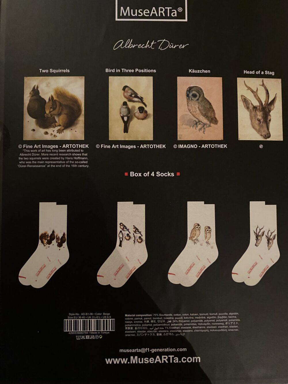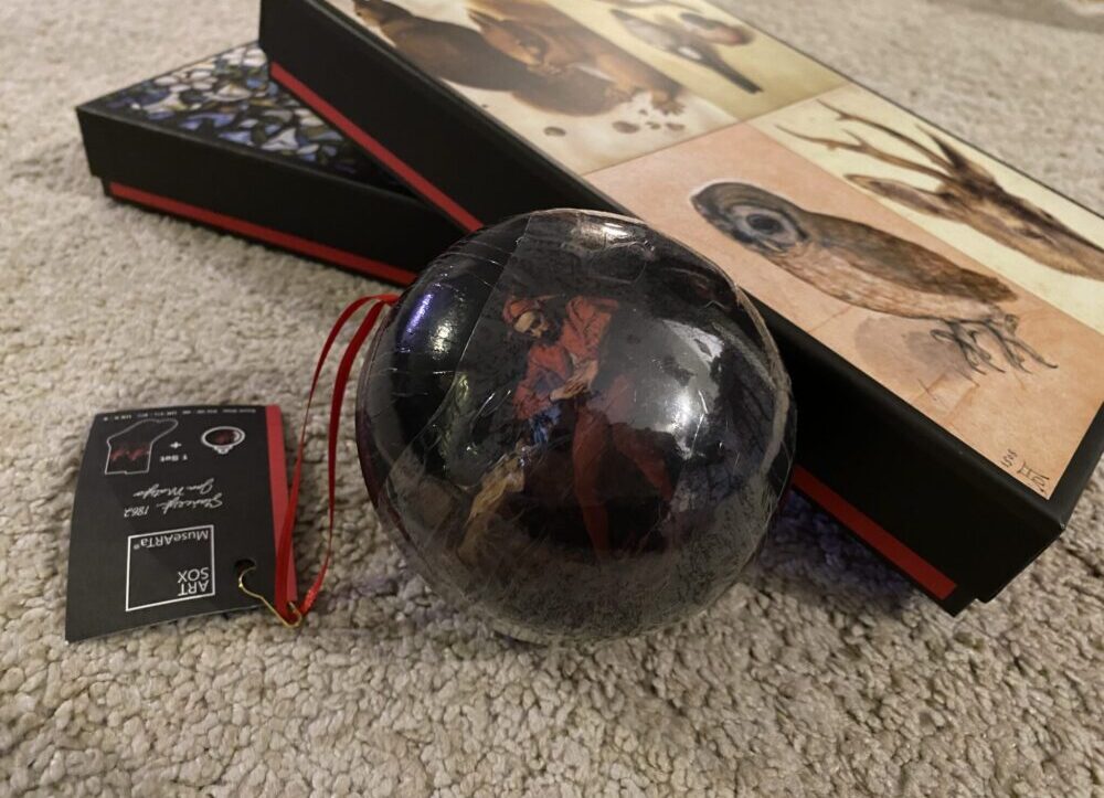 Loistava idea joululahjaksi on MuseARTan valmiit lahjapakkaukset, joissa valikoiman sukkia saa mielettömän hienossa lahjarasiassa. Itse valitsin Albrecht Dürerin Animal motifs -lahjapakkauksen, Louis Comfort Tiffany -lahjapakkauksen sekä veikeässä joulupallossa olevan Jan Matejko, Stańczyk -sukkaparin. Lahjapakkaukset ovat huikean hieno lahja, ja joulupallot ovat supersöpö idea niin lahjaksi kuin joulukalenterin täytteeksi. Joulupallostahan saa vielä joulukuuseen taiteellisen koristeen!